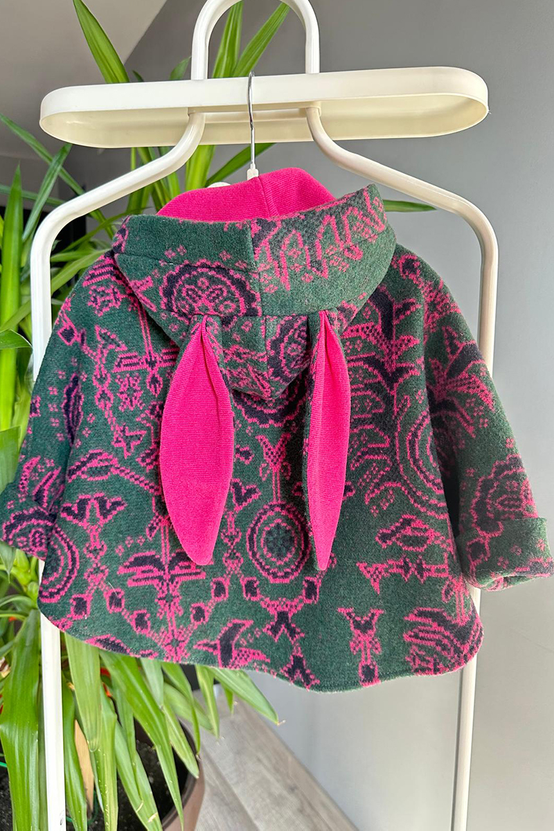 Îmbrățișează sezonul rece cu această capă adorabilă din lână naturală, creată special pentru confortul și libertatea de mișcare a celor mici. Cu un croi lejer și glugă practică, este ușor de îmbrăcat și purtat în orice moment al zilei. Închiderea frontală cu capse o face ideală pentru copiii activi, iar buzunarele aplicate cu buline din lana colorată si ureciusele de iepuras adaugă o notă jucăușă și stilată.