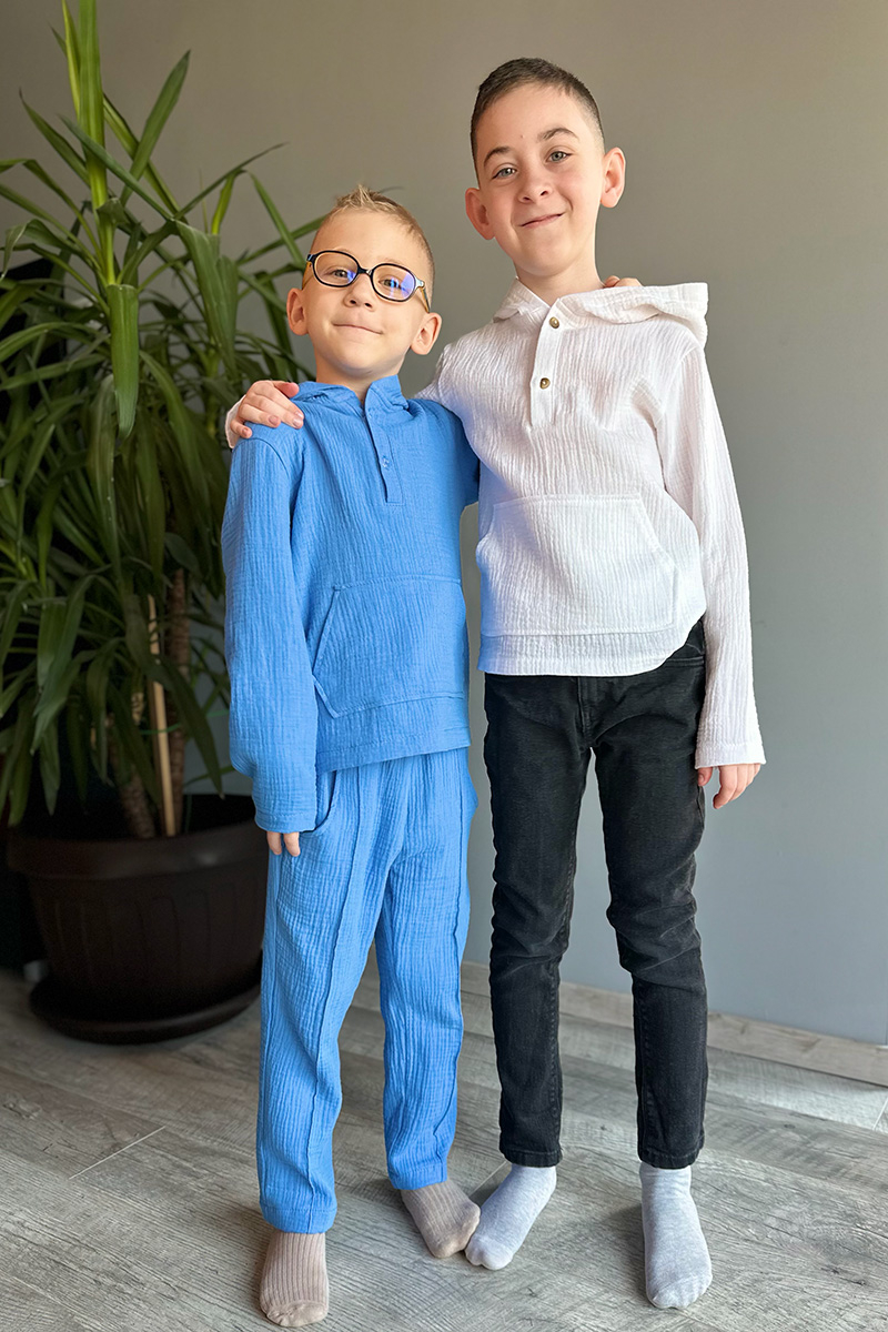 Cămașă tip hanorac din muselină 100% bumbac, pentru băieți 1–8 ani. Moale, aerisită, lucrată manual în România. Combină cu pantalonii din colecție. ✦ H. Bebe