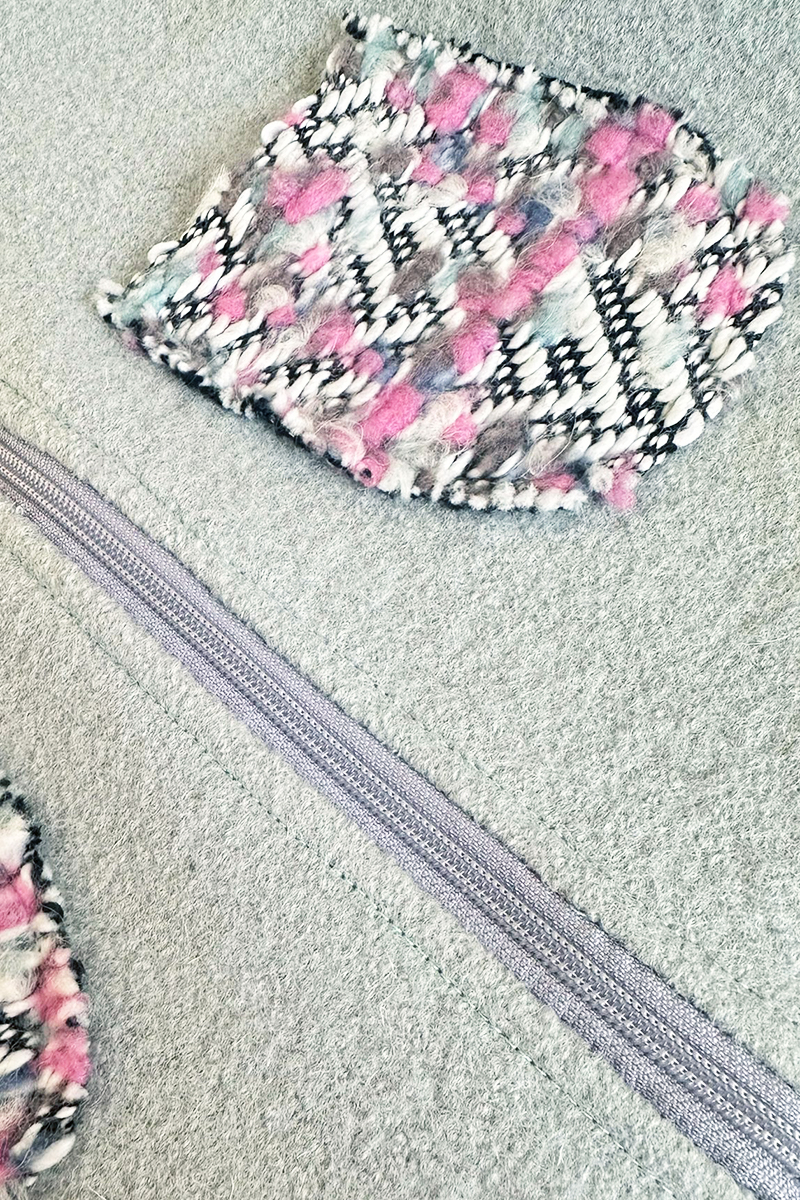 Exterior: 100% lână boucle (gsm 280 g /mp); material certificat Mulesin Free, Oeko-Tex Standard 100 Product class II. Dublura: Bumbac matlasat (gsm 250 g/mp), 69% bumbac, 29% polyester, 2 %elastan
