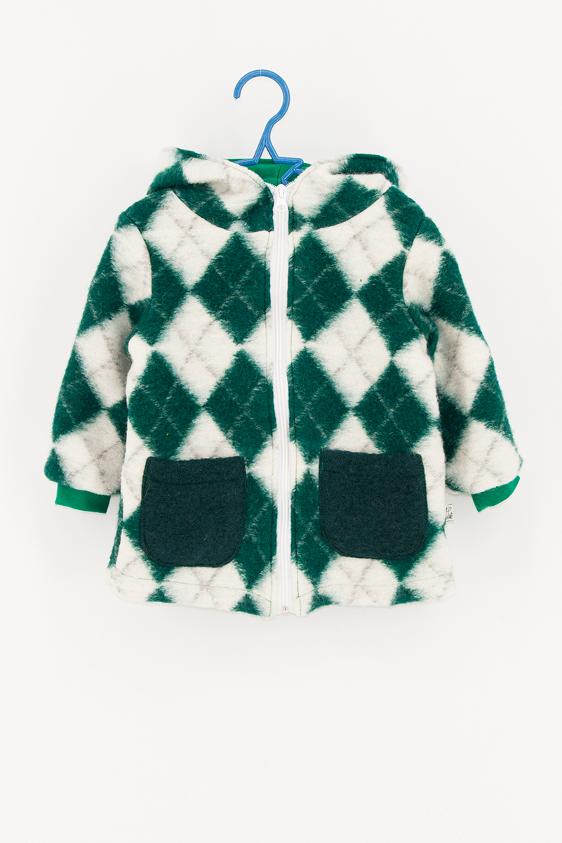 Jacheta din lână fiartă cu glugă și fermoar este alegerea potrivită pentru sezonul rece toamnă-iarnă. Stratul exterior este din lână(400-450 g/mp), iar dublura este din bumbac pentru a asigura un confort sporit copiilor care nu agrează lâna. Datorită densității materialelor, acest produs izolează foarte bine termic.