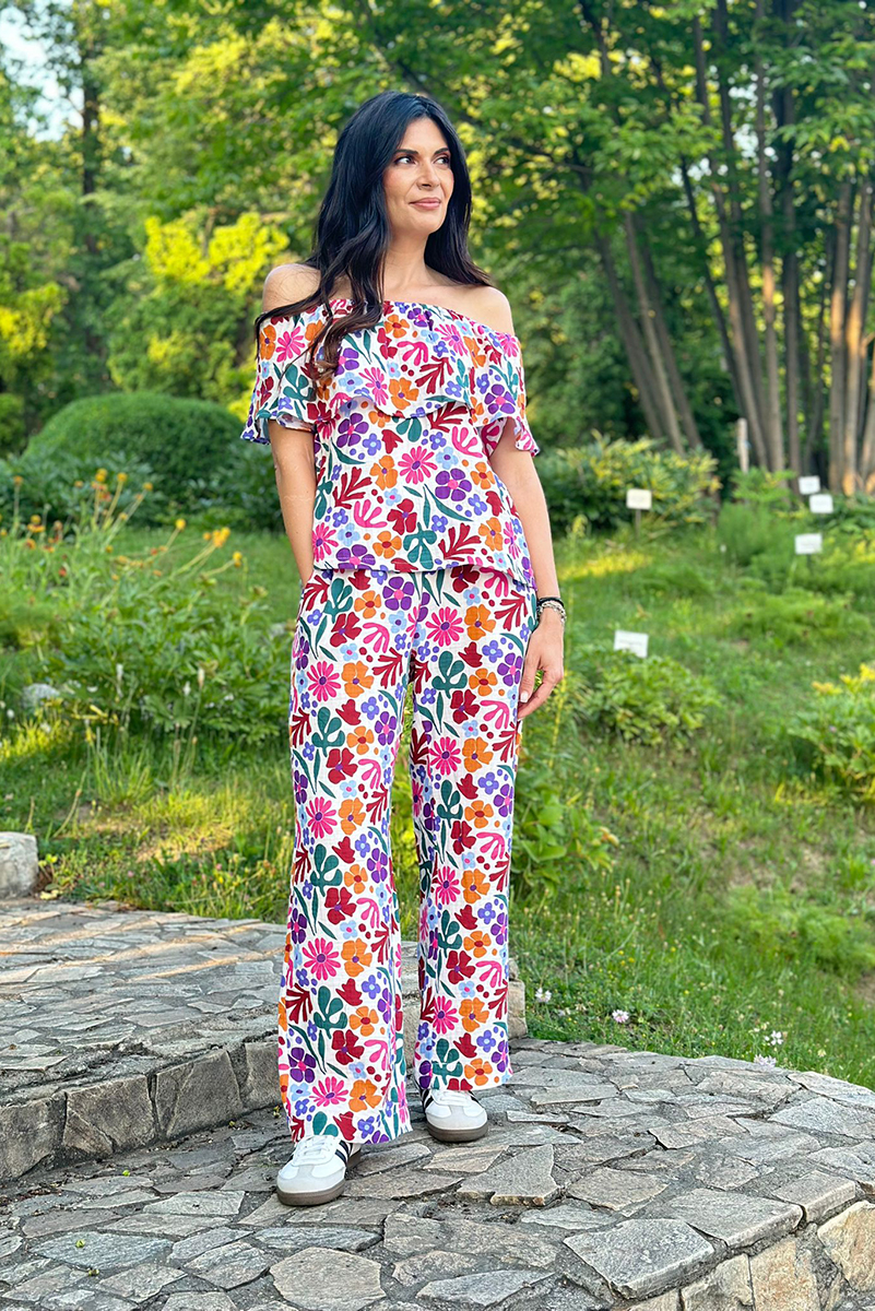 - Compleul din muselină este format dintr-o bluză cu volan, cu o croială delicată și finisaje elegante, combinată pantaloni cu croiul de tip wide asortați, într-un stil care conferă o notă feminină și sofisticată.