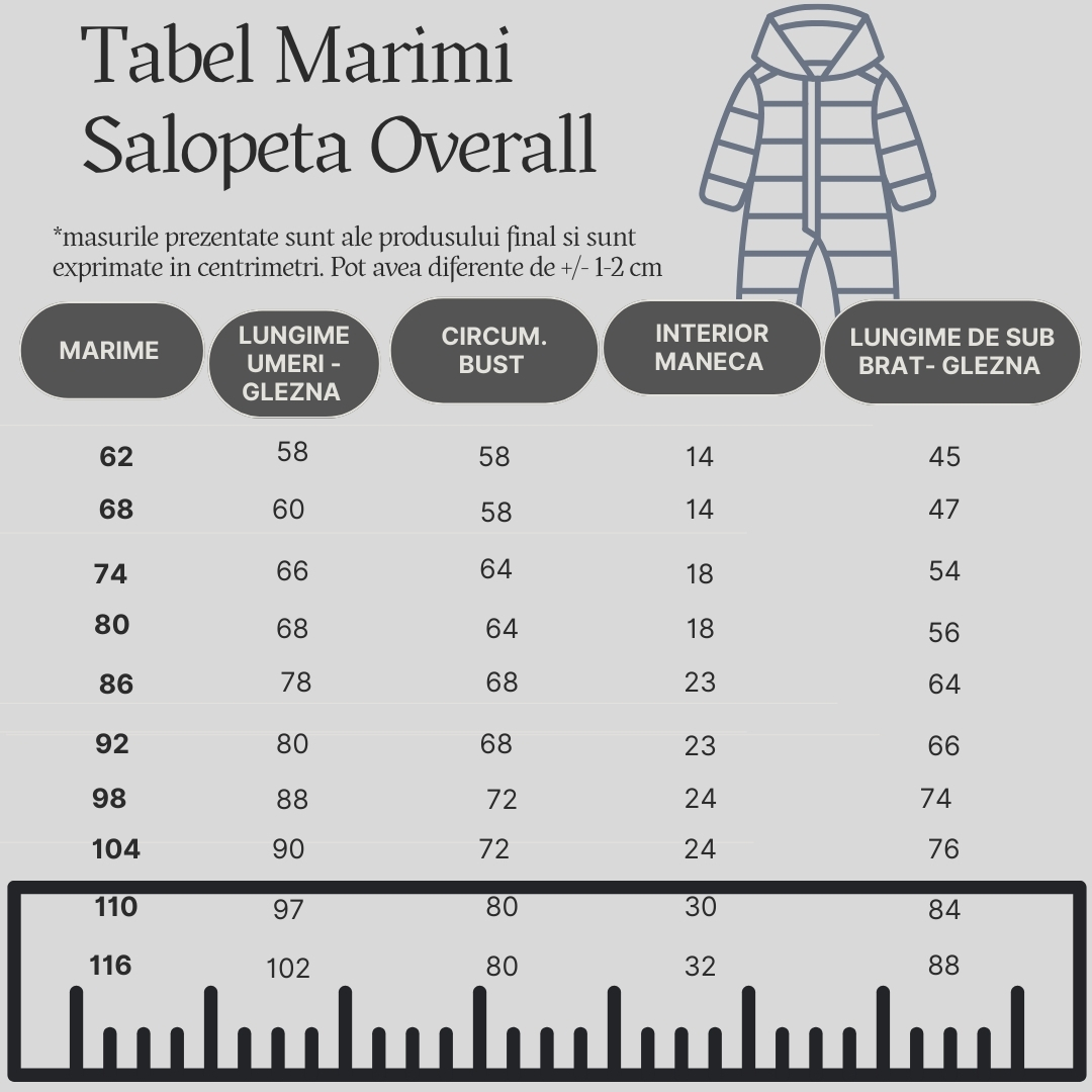Este extrem de potrivită perioadelor reci, purtată că și strat exterior, fiind un bun izolator termic chiar și la temperaturi cu minus grade. Este atât calduroasă, cât și impermeabilă. Salopeta este rezistentă, se îmbracă ușor și asigură un confort termic sporit, fiind creată special pentru micuţii curioși și veseli cu vârsta cuprinsă între 0 și 4 ani.